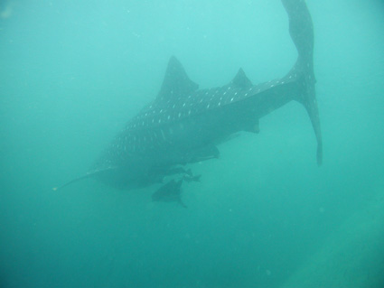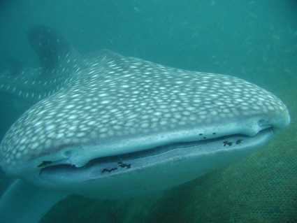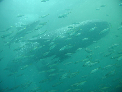 | ジンベエザメ ・分類:ジンベエザメ科-ジンベエザメ属 ・学名:Rhincodon typus ・英名:Whale shark ・熱帯から亜熱帯の表層域に棲息する。 ・大きさは、14m以内。 ・背中に縦の白い線があり、背中全身に白色の斑点がある。 和名の由来は、模様が『甚平(=甚兵衛)』に似ていることからきている。 英名は、多分鯨のように大きいからである。 よくマグロと一緒に泳いでいることがあり、漁師達が『エビスザメ』と呼んでいることがある。 ・ウバザメやメガマウスザメと同じでプランクトンを食べる。ウバザメは、口を開けたまま泳いでプランクトンを食べるが、 ジンベエザメは、口の中を真空状態にして口を開いて一気に水を口の中に入れて、鰓耙でプランクトンを濾しとって食べている。 ・2002年11月の第12回ワシントン条約でフィリピン、インド、マダガスカルの提案でジンベエザメの保護に関する会議が行われた。 現在、ウバザメと一緒に保護を受けている |